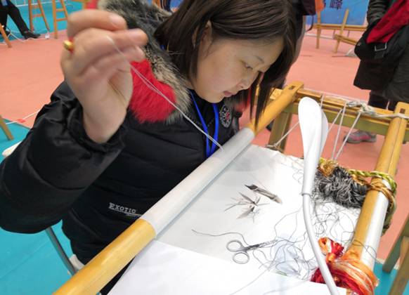 省残联副理事长杨志远在刺绣比赛现场观摩我市选手朱丽霞的比赛